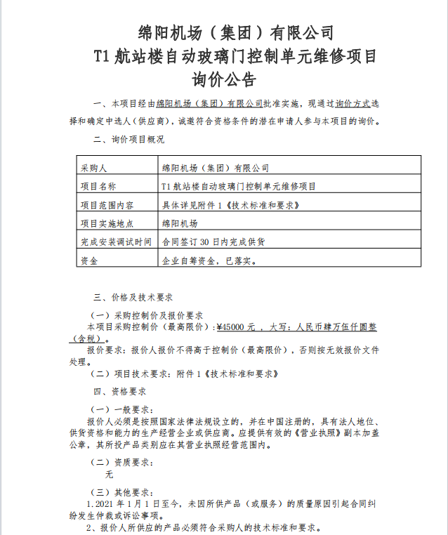 綿陽機場(集團)有限公司 T1航站樓自動玻璃門控制單元維修項目詢價公告