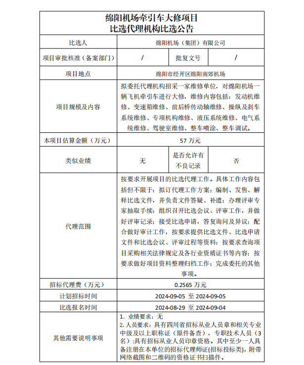 綿陽機(jī)場牽引車大修項(xiàng)目比選代理機(jī)構(gòu)比選公告